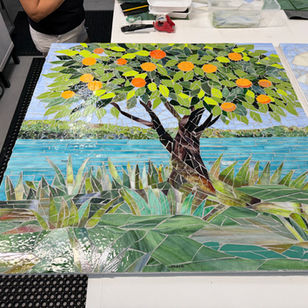 Our newest healthcare commission for Lakeland Regional Hospital is well underway. The glass mosaics, inspired by the lakes, citrus groves, and birdlife of Central Florida, are now moving from final artwork designs into full-scale fabrication in our Bonita Springs studio.