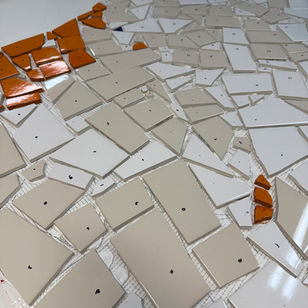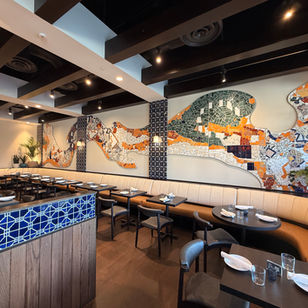 Each piece was carefully selected and placed to create rhythm, depth, and color variation, resulting in a one of a kind artwork that interacts with light and space throughout the day. The irregular geometry and layered textures reflect the spirit of Mediterranean mosaic traditions while maintaining a contemporary presence suited for a modern urban setting.